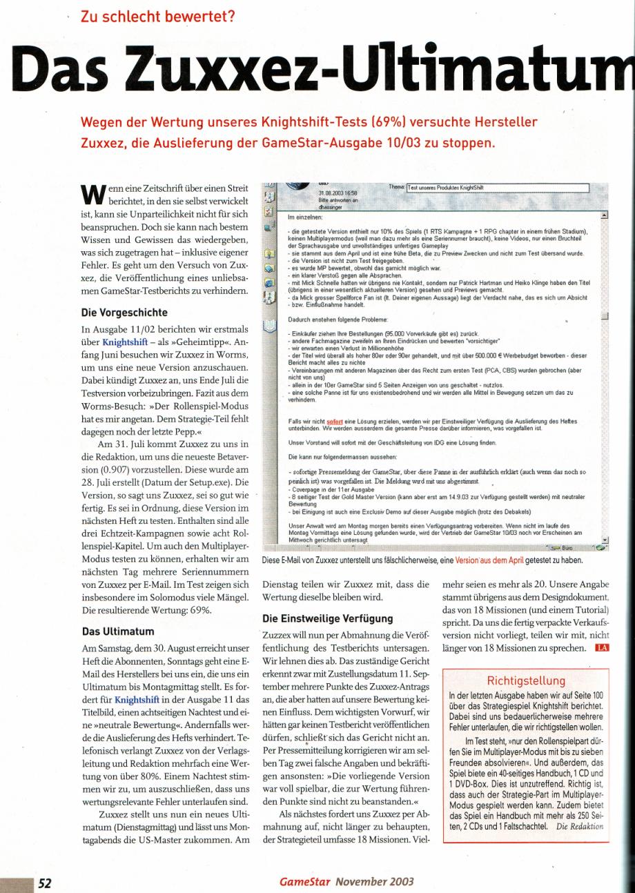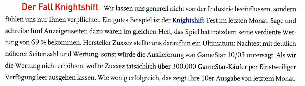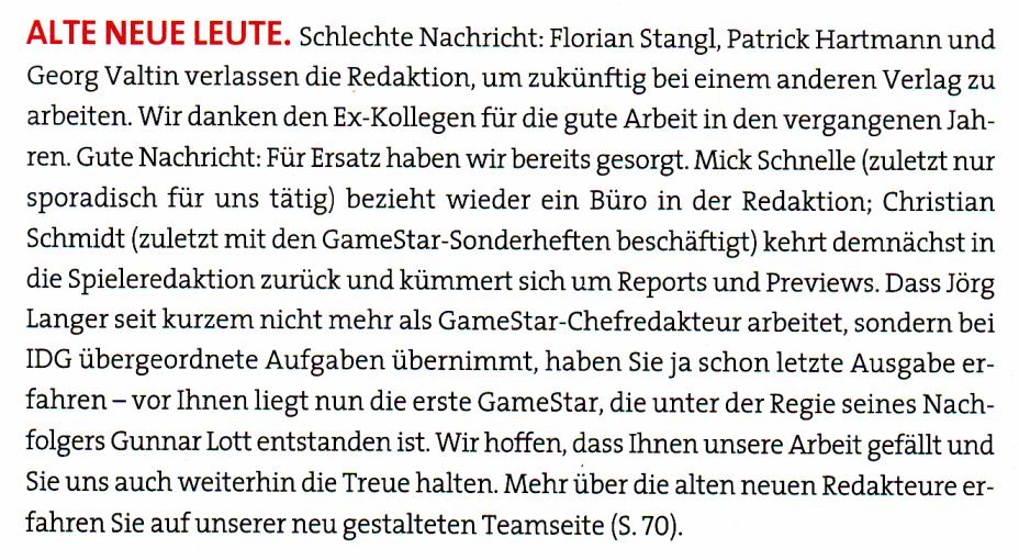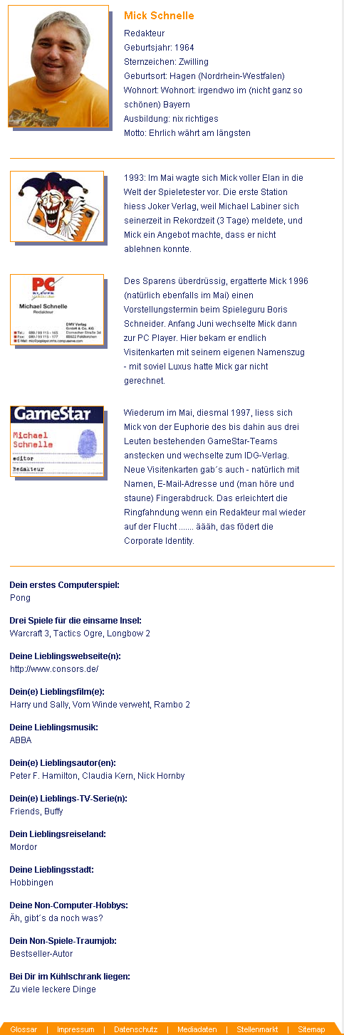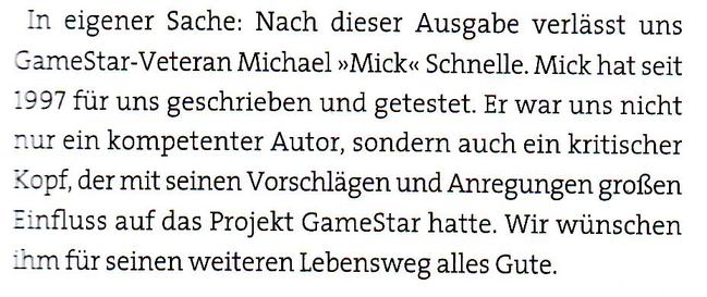 "Wir waren mal [Game]Stars..." Mit der kommenden Ausgabe der PC-Spielezeitschrift GameStar ist kein Redakteur der Gründungsmannschaft von 1997 mehr an Bord - Michael "Mick" Schnelle verlässt das Magazin nach dem aktuellen Heft 10/2006: In eigener Sache: Nach dieser Ausgabe verlässt uns GameStar-Veteran Michael "Mick" Schnelle. Mick hat seit 1997 für uns geschrieben und getestet. Er war uns nicht nur ein kompetenter Autor, sondern auch ein kritischer Kopf, der mit Vorschlägen und Anregungen großen Einfluss auf das Projekt GameStar hatte. Wir wünschen ihm für seinen weiteren Lebensweg alles Gute. (Editorial 10/2006)Wahrscheinlich war kein Redakteur der GameStar über die Jahre so umstritten wie Mick Schnelle, der 1993 seine Laufbahn als Spieleredakteurs beim längst untergegangenen Joker Verlag begann. Während der Zeit bei GameStar verfasste Mick einige unausgewogene Tests (z.B. Wizards & Warriors, Wizardry 8, Die Gilde, Rollercoaster Tycoon, Silent Hill 4), die das kritische GameStar-Forum in Aufruhr versetzten. Hier erfuhr Mick Schnelle nicht selten beleidigende Anfeindungen, aber trotzdem versuchte er sich wacker der Kritik zu stellen (was lange Zeit keine Selbstverständlichkeit bei der "unfehlbaren" GameStar war). Obwohl sich GameStar und auch Mick selbst oft herablassend und gehässig gegenüber Konsolen verhielten, war Mick als Projektleiter maßgeblich für das GameStar-Sonderheft "Spiele-Konsolen" Anfang 2001 und später im Frühjahr 2002 ebenfalls als Projektleiter für die Nullnummer der GamePro verantwortlich. Als das Heft mit Ausgabe 10/2002 in Serie ging, saß dort jedoch der spätere GameStar-Chefredakteur Gunnar Lott am Steuer... Im Schatten des Zuxxez-"Skandals" Ende 2003 ("Das Zuxxez-Ultimatum" 11/2003), in den Mick durch seinen unglücklichen aber doch haltbaren KnighShift-Test verstrickt war (10/2003), verließ er still und heimlich die GameStar nach Ausgabe 11/2003, offiziell um endlich seinen Traum vom Romane schreiben zu verwirklichen. Bereits in Ausgabe 1/2004 war er jedoch als freier Mitarbeiter wieder dabei: Und auch unser verdienter Simulationsexperte Mick Schnelle schreibt weiter für uns, als freier Mitarbeiter.Einen vollwertigen Roman hat Mick Schnelle in der Zeit wohl nicht veröffentlichen können, aber einige Western-Heftromane (z.B. Jack Slade Nr. 222, wie Mick im Forum am 07.04.05 mitteilte). Überraschend schnell erfolgte dann Micks komplette Rückkehr Ende 2005, nachdem bei GameStar ein Redakteursschwund infolge des baldigen PC PowerPlay-Launches einsetzte: Mick Schnelle (zuletzt nur sporadisch für uns tätig) bezieht wieder ein Büro in der Redaktion; [...].Die genauen Umstände dieser erneuten Vollanstellung sind nicht bekannt, aber sein neuer Vertrag war rückblickend auf zwei Jahre befristet. Und nach Ausgabe 10/2006 war dann Schluss. Gunnar Lott erklärte im Forum am 03.08.06: Mick wurde keineswegs rausgeworfen. Mick hatte von vornherein (nach seiner Rückkehr 2004) einen befristeten Vertrag. Der ist jetzt ganz regulär ausgelaufen, und unser Verlag sieht sich, schweren Herzens, derzeit nicht in der Lage, ihm einen Folgevertrag anzubieten. Mick wusste bereits bei der Einstellung, dass das ein nicht unwahrscheinliches Szenario ist. Das ganze ist ein relativ normaler Prozess, kommt in der Wirtschaft täglich tausendfach vor.Mick verlautbarte daraufhin am selben Tag u.a.: [...] Und ich will auch gar nicht mehr zurück. Man kündigt mir nur einmal. Denn eine Kündigung war es schließlich, wenn Gunnar das auch anders sieht bzw. anders formuliert hat. Allein schon, daß ausschließlich noch Zeitverträge geschlossen werden, lässt tief in die Unternehmenskultur blicken. Hier deuten sich amerikanische Verhältnisse des Hire&Fire an, die in den kommenden Jahren sicher noch verschärft werden. Doch genug gemosert. Ich will nicht weinerlich klingen. Ein Ende ist auch immer ein Anfang und um mich müßt Ihr Euch sicherlich keine Sorgen machen. Ach ja, ich hatte ihn ja gelöscht. Aber da sich jetzt wieder alles ein wenig beruhigt hat, ist jeder der mag herzlich eingeladen meinen blog unter http://mick-schnelle.blogspot.com/ zu besuchen. Allerdings gibt es da kein GS-Bashing oder sowas sondern zumeist recht private Gedanken zu diesem und jenem, die ich gern mit jedem der Spaß daran hat diskutiere. [...]Offensichtlich gekränkt hatte Mick dann aber doch bereits am 28.07.06 in seinem noch jungen Weblog "Die Welt ist böse" einen dezenten "GS-Bashing"-Eintrag verfasst: Daß ich bei GameStar gehe, ist ja mittlerweile kein Geheimnis. Das »Warum« ja auch nicht (die Raffgeier bei uns sind eben so innovativ und streichen bei Leserschwund Stellen, also meine). Doch das ist nebensächlich. Viel wichtiger: Als ich das letzte Mal vor zwei Jahren gegangen bin, ist mir der Abschied dank des freundlichen Drücker-Duos Langer und Stangl sehr leicht gefallen. Doch diesmal ist das deutlich schwieriger. Das liegt vor allem an den beiden Kollegen Fabian und Pia. [...]Da die Diskussion im GameStar-Forum längst im Gange war, legte Mick dort am 03.08.06 nach: >>Zitat von Gunnar Lott:GameStar-Chefredakteur Gunnar Lott wollte diese in meinen Augen durchaus wahre Kritik (die Mick jetzt, wo er "raus dem Business" ist, leicht von den Lippen geht...) nicht stehen lassen: wir machen, wie du ja auch aus erster hand weißt, beides: wir beugen uns dem leserwillen bei hype-themen, wir bringen neue sachen auf, wir recherchieren entwicklungen.Hier endet diese kleine Übersicht über Micks Wirken in der deutschen Spieleszene. "Wir wünschen ihm für seinen weiteren Lebensweg alles Gute." Mick im Internet: